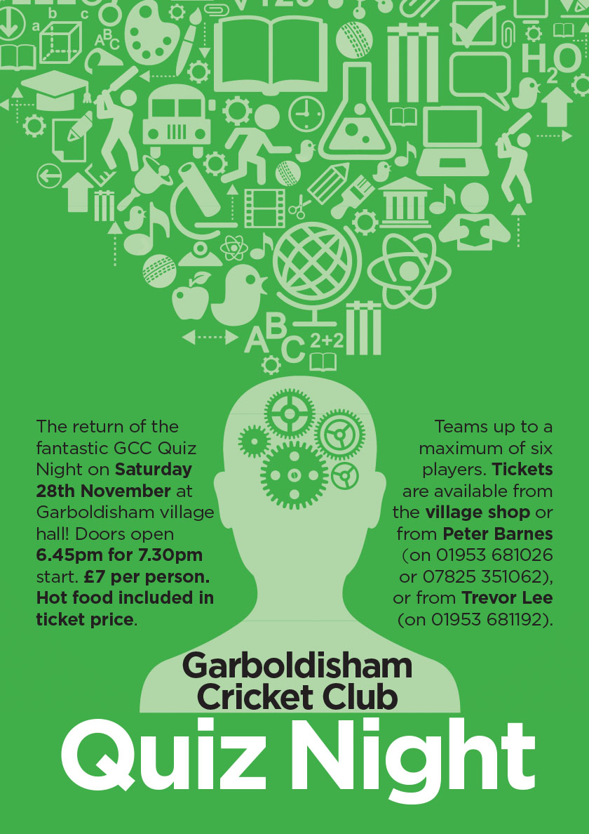 2015 Published on November 18, 2015 Quiz night: Don’t forget to book your places! written by Nick Paul Just 10 days to go until the GCC Quiz night at Garboldisham village hall on Saturday 28th November. Doors open at 6.45 for a 7.30 start. £7 per person including hot food. Book your places now. Teams can be up to a maximum of six players. Don’t worry if there’s only a couple of you because we can always pair you up with others to make a bigger team. You can buy tickets from the village shop or from Peter Barnes 01953 681026/07825 351062 or from Trevor Lee 01953 681192. See you there!